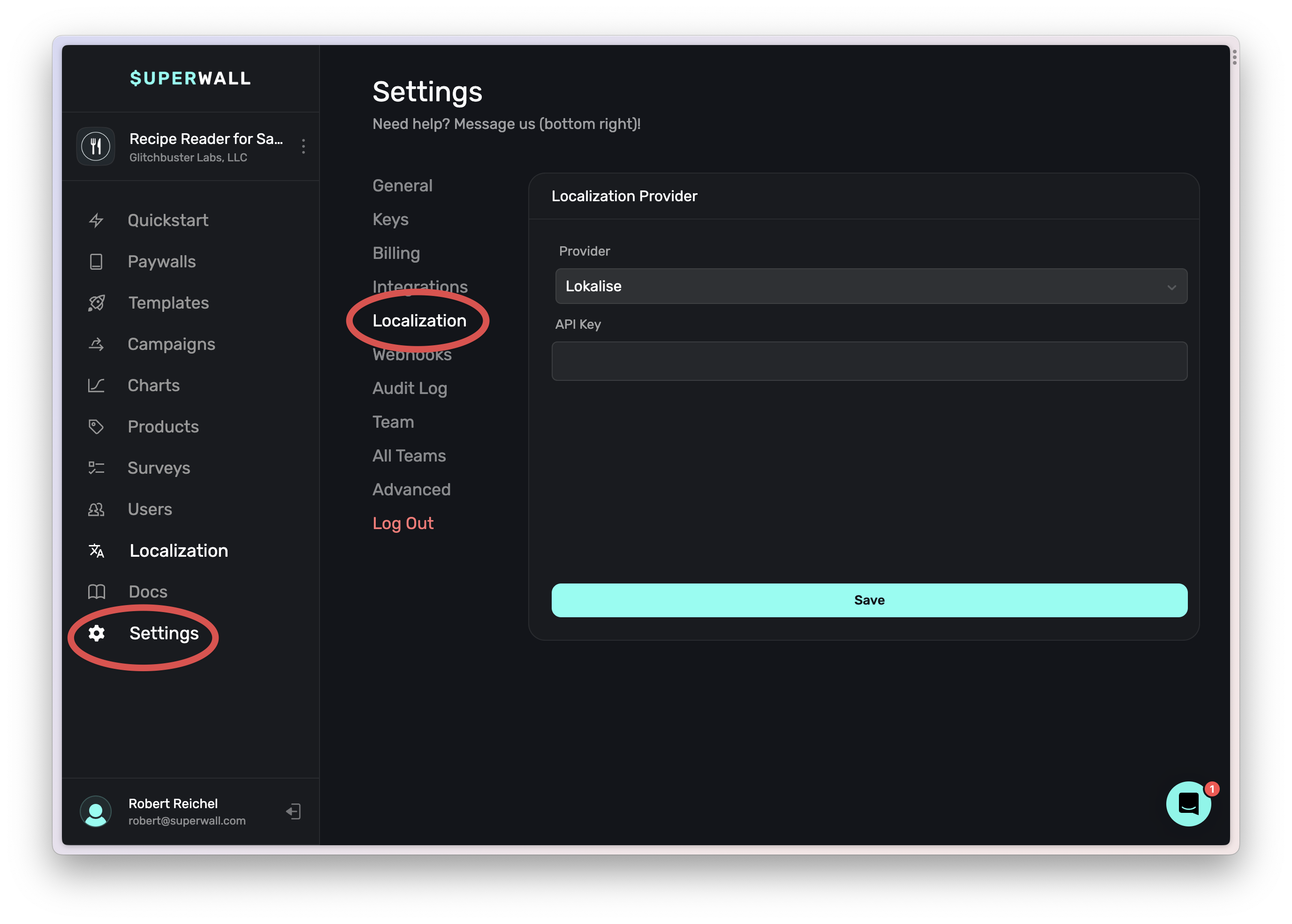 Once you've got the token, head on over to Superwall and select Settings -> Localization. Choose Lokalise from the dropdown and enter your API key.
